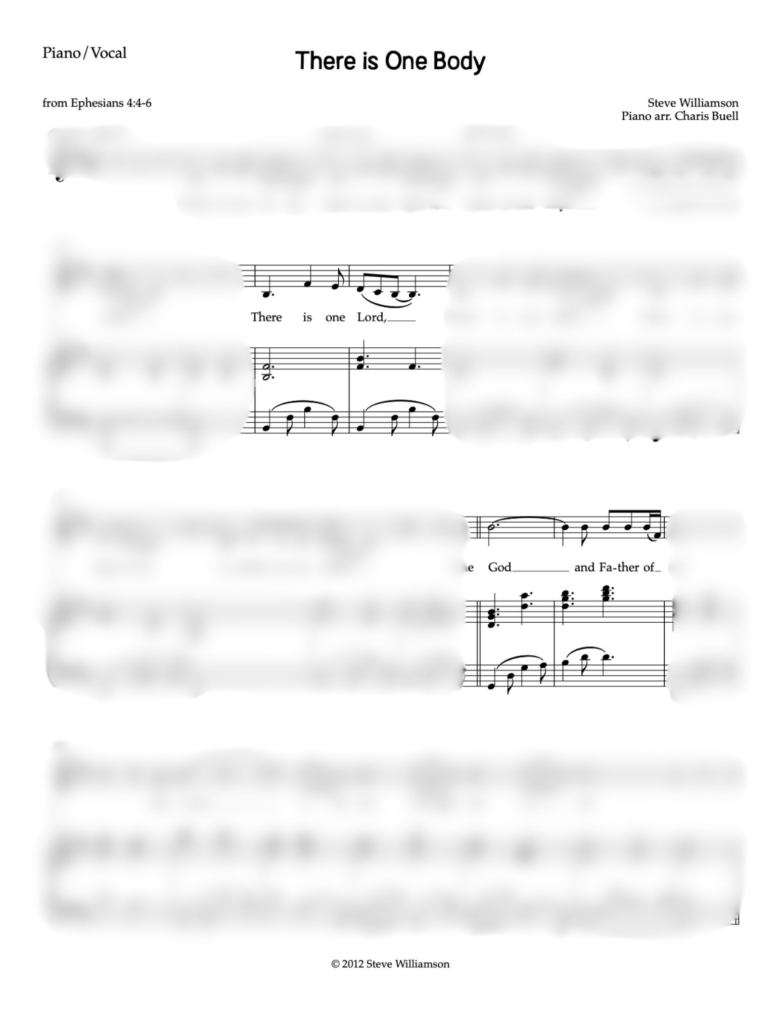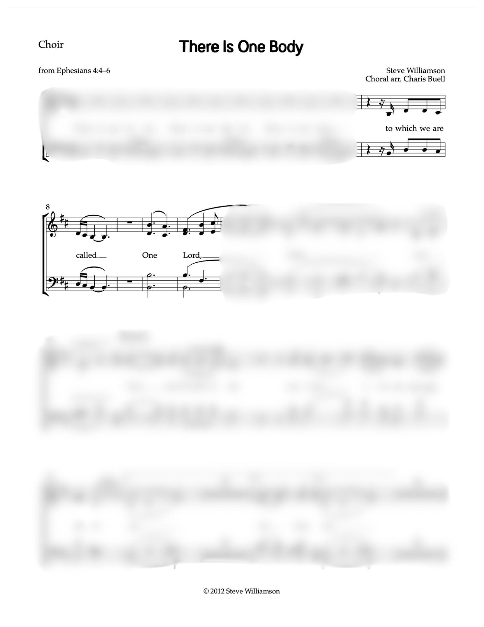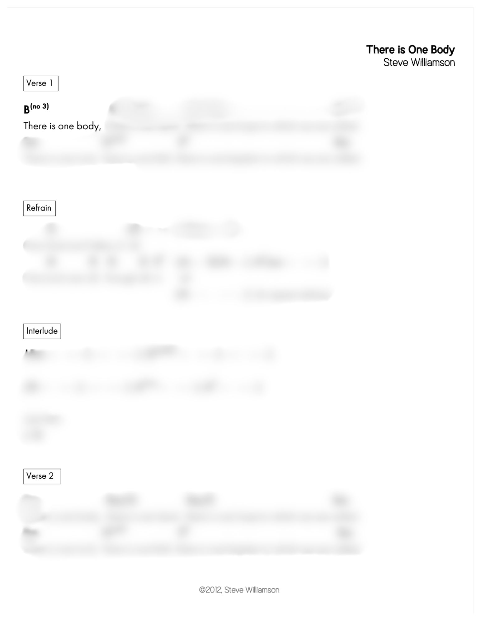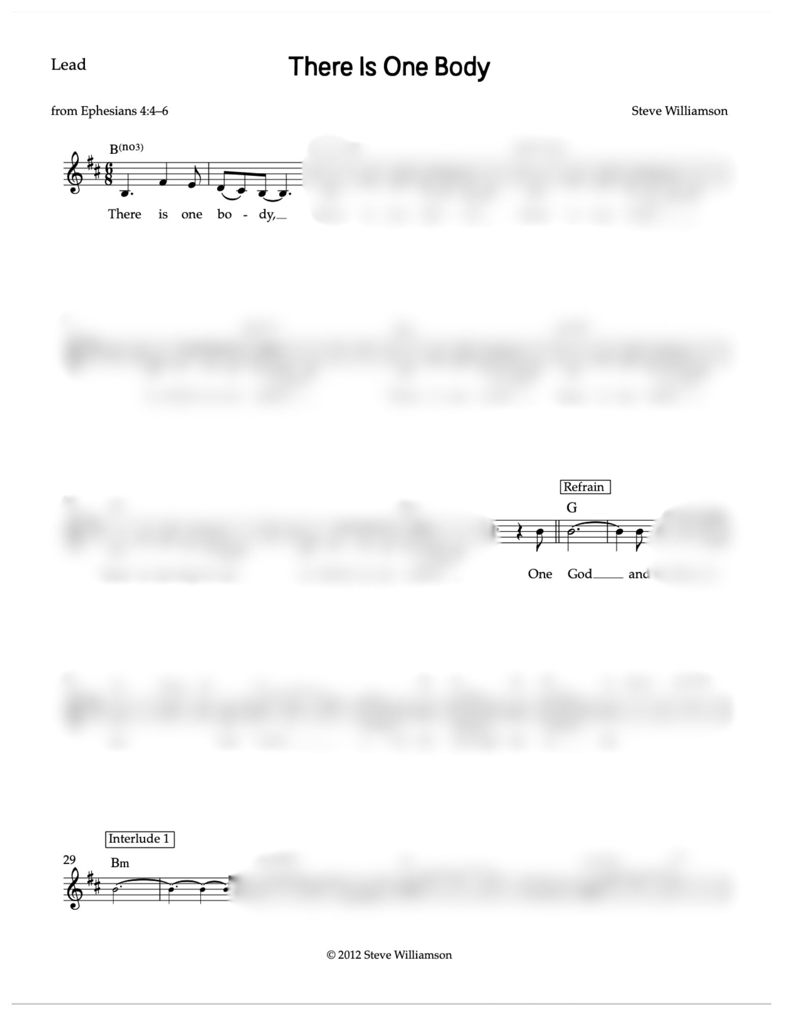 The lead sheet, chord chart, piano/vocal sheet music (difficult), choir sheet music, and strings sheet music for There is One Body for one great price!
